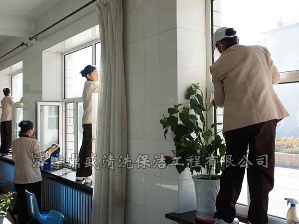 3、擦玻璃:先用毛巾把玻璃框擦拭干净,再用涂水器沾稀释后的玻璃水溶液,均匀的从上到下涂抹玻璃,有顽固的污渍用铲刀清除干净,再重复以上工序后用,刮子从上到下刮干净,用干毛巾擦净框上留下的水痕,玻璃上的水痕用机皮擦拭干净。